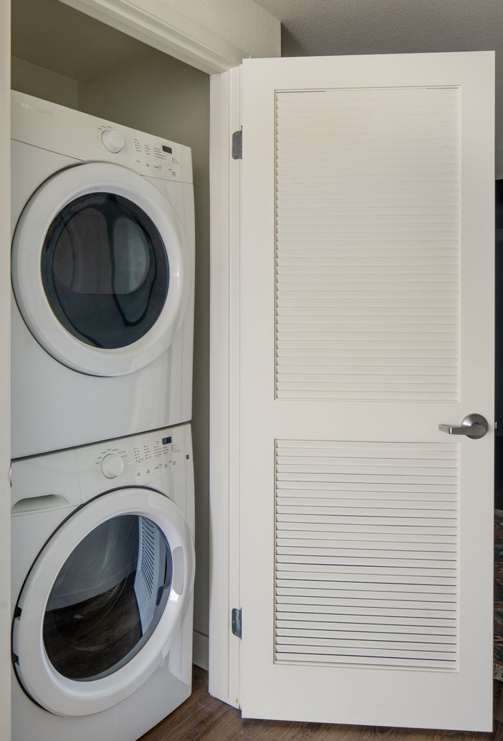 The full kitchen features sleek stainless steel appliances, including a double-door refrigerator, and generous closet space supports easy organization. Smart-home touches include a Nest thermostat and in-unit front-loading washer and dryer. The large bathroom adds comfort, and one assigned parking space is included in a secure, gated garage.