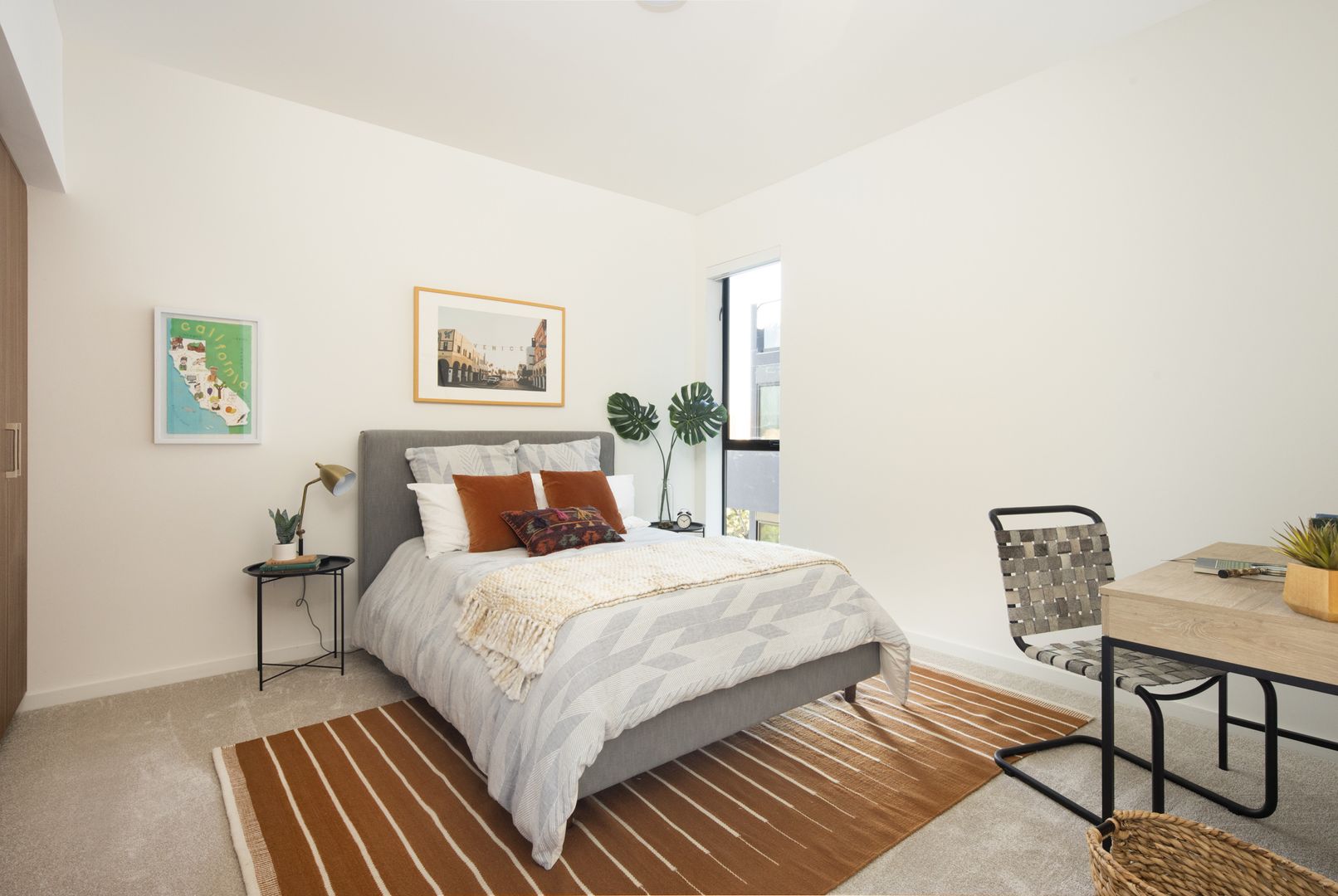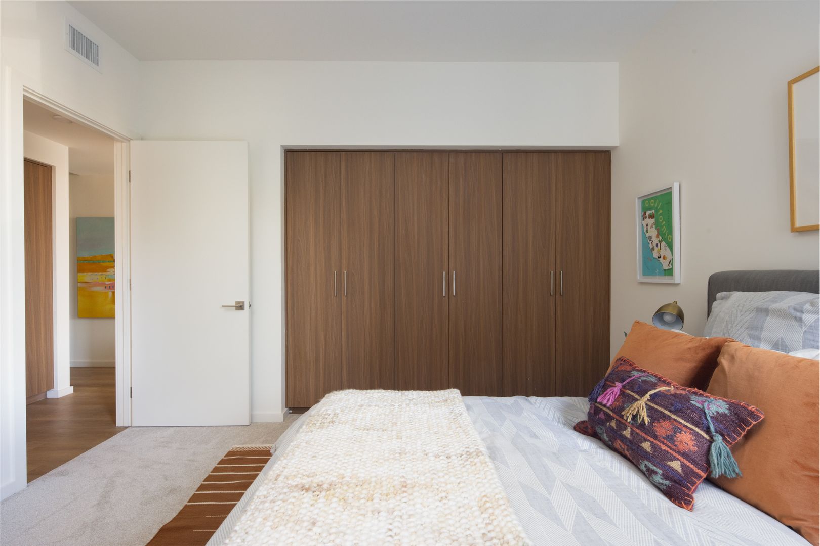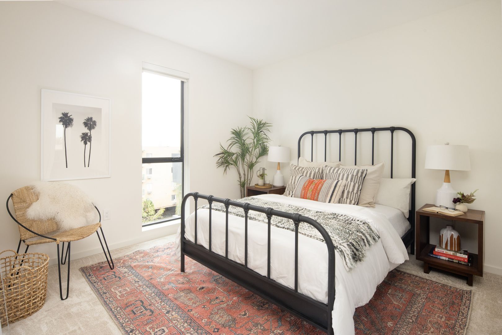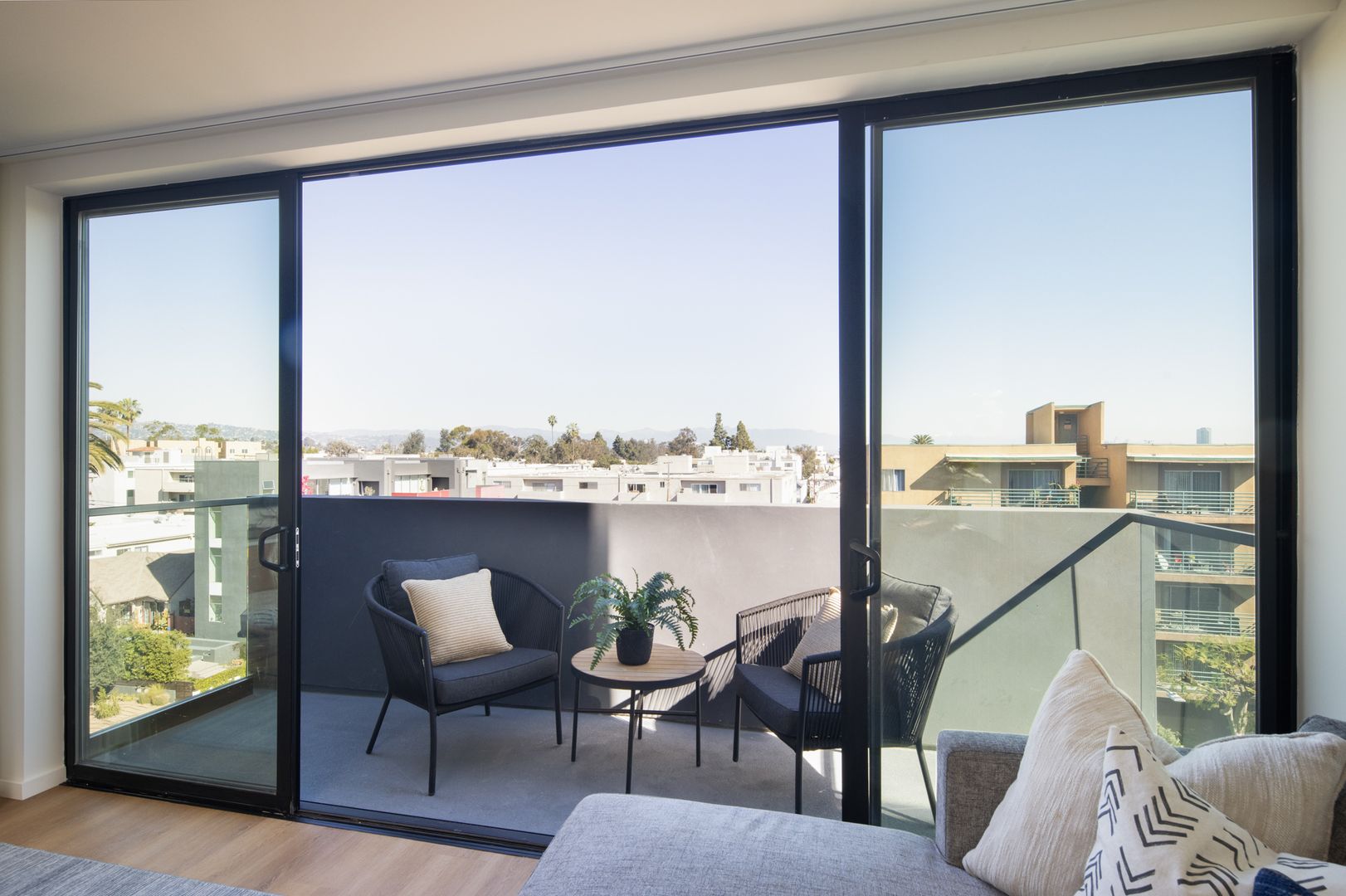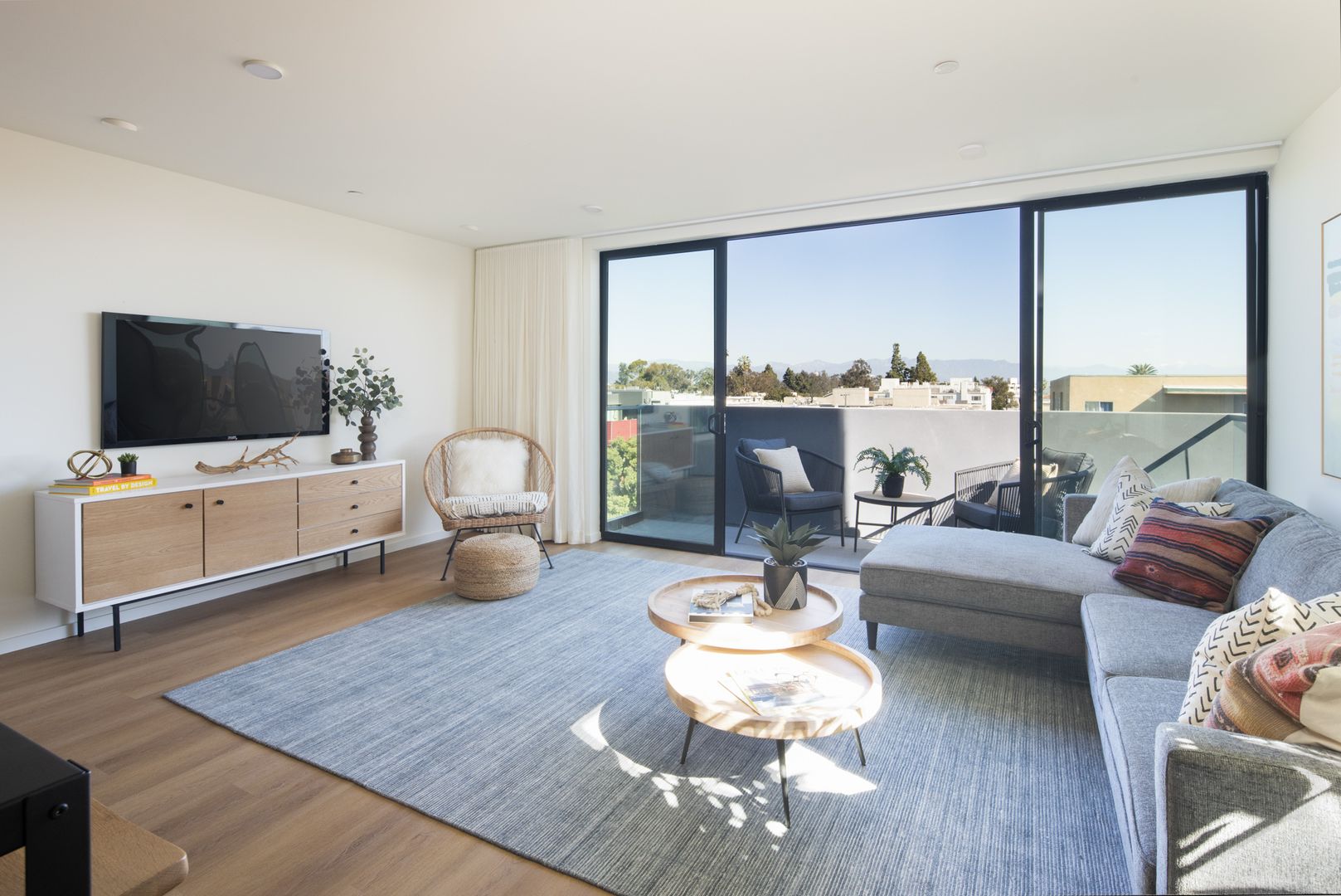 This spacious two-bedroom unit at Frame Downtown Culver City offers a bright, open floor plan with a balcony and stunning views. The home features 9FT ceilings and an abundance of natural light throughout. The gourmet kitchen is thoughtfully designed with custom finishes and includes modern appliances such as a refrigerator, dishwasher, range and oven, and microwave—perfect for cooking and entertaining. The primary bedroom features plush carpeting and an en suite walk-in closet with customizable Elfa shelving for optimal organization. The living area is enhanced by large sliding doors, offering a seamless indoor-outdoor flow, while wood-like flooring extends through the common spaces for a modern touch. Additional conveniences include an in-unit washer and dryer, smart technology with a Nest thermostat system, and tandem parking.